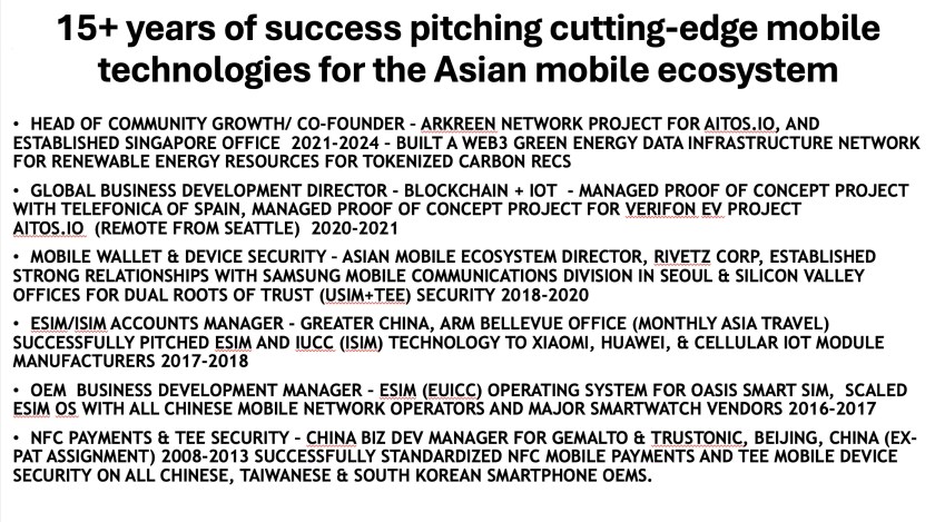 I worked for Freescale Semiconductor from 2004 to 2005 in Tempe, Arizona. They had just spun out from Motorola Semiconductor and taken over a real FAB and design center in Arizona. I was initially hired to help build an Asian market presence for a wireless audio chip. Later, I worked on ZigBee protocol chips to help standardize them in Asia. In 2008, I was hired by the global leader in smart card technology, French-owned Gemalto. I worked in their Beijing office to promote their SWP-NFC uSIM cards designed for smartphone OEMs. These cards allowed secure NFC mobile payments via uSIM cards. After completing that mission, Gemalto acquired Trusted Logic, an embedded mobile security software OS firm, in late 2009 and I becametheir Account Manager too. They embedded the TEE (Trusted Execution Environment) operating system into ARM’s “Trustzone” hardware-based security architecture. This system protects data and code on Android devices for Asian smartphones. It also secures mobile wallet payment details. Trusted Logic spun out into Trustonic in 2012. I worked for both firms in China as a Gemalto employee from 2008 to 2013 in Beijing, managing APAC and serving as NFC & TEE Country Manager. I initially promoted eSIM (eUICC) to Asia and Apple in 2016 with Oasis Smart SIM. Then, I worked for Simulity Labs in 2017 pitching their eUICC operating system. ARM acquired Simulity Labs. I pitched both eSIM (eUICC) and iSIM (iUICC) as an ARM employee from 2017 to 2018. After 2018, ARM spun them out into Kigen. From 2018 to 2020, I worked for Rivetz Corp. This ICO featured a unique “Dual Roots of Trust” mobile security wallet application for Android os on Chinese and South Korean Smarphone OEMs, based on integrating uSIM card + TEE security for data at rest in a firewall (vault) environment for ARM Trustzone to protect crypto-wallet private keys. In January 2020, I was hired by a steathly Shanghai design house and began working remotely due to the COVID-19 pandemic for Aitos.io as their Global Business Development Director, promoting the “BoAT” Blockchain of AI Things from 2020-2021. The BoAT is an SDK middleware framework embedded in cellular IoT modules to enable Blockchain compatibility. In late 2021 with massive funding from WanXiang Group (Shanghai), Aitos.io shifted gears to an ESG and Green energy theme. I was appointed Head of Community Growth in Singapore. My role was to help build ‘Arkreen,’ a green energy data infrastructure network. It features a smart data logging dongle attached to Solar PV panels. This dongle collects and converts green energy into green data. The data supports the on-chain creation of tokenized carbon RECs for climate actors and activists.