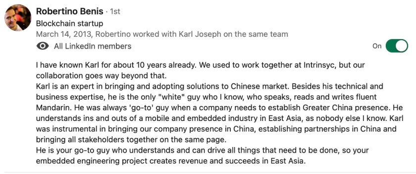 LinkedIn Reference page – Karl Weaver Please note many more references are available from my LinkedIn profile at: https://www.LinkedIn.com/in/karljweaver/ https://www.linkedin.com/in/karljweaver/details/recommendations/?detailScreenTabIndex=0 Share this: Share on X (Opens in new window) X Share on Facebook (Opens in new window) Facebook Like Loading...